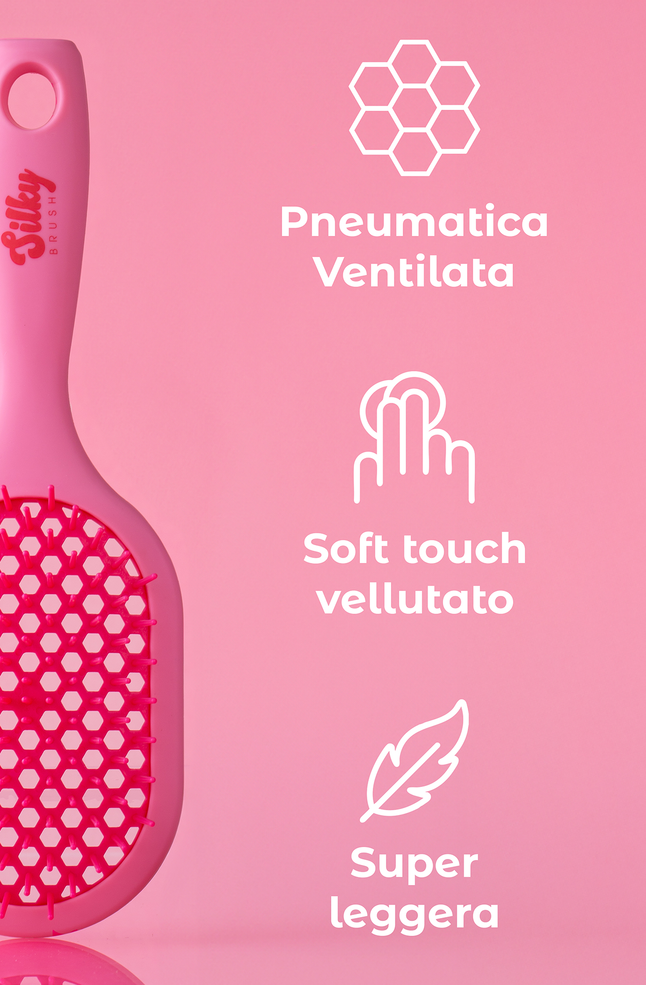 Le setole antistatiche districano senza spezzare e combattono l’effetto crespo, mentre l’impugnatura soft touch vellutata è una vera coccola per le mani.
